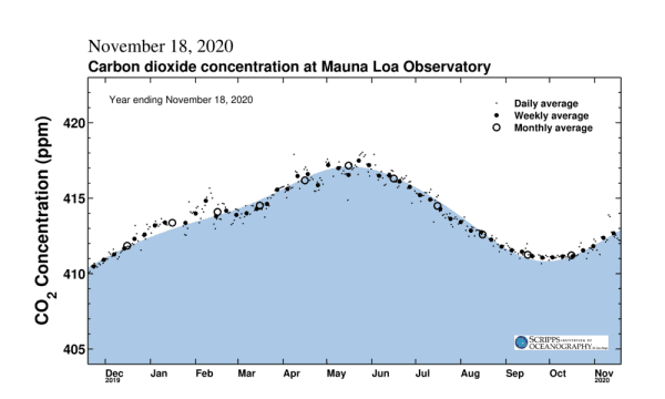 På bara 10 år har halten ökat från 393 ppm och 2013 passerades 400 ppm för första gången i mänsklighetens historia. Enligt NASA var den globala genomsnittliga koncentration av atmosfärisk koldioxid i september cirka 415 ppm, vilket är en ökning med 32 procent sedan mätningarna började 1958 och har sedan stadigt ökat.