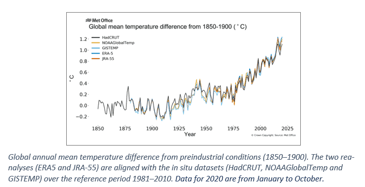 Baserat på mätningar till och med oktober, förutsäger WMO att den genomsnittliga temperaturen i världen år 2020 kommer att vara ungefär 1,2 grader över förindustriell nivå. Tidigare har de rekordvarma åren sammanfallit med väderfenomenet El Niño som har en uppvärmande effekt, vilket inte har inträffat under 2020. Istället har året inneburit en La Niña som tvärtom borde ha en avkylande effekt, men som inte verkar ha haft stor påverkan på den globala temperaturen.